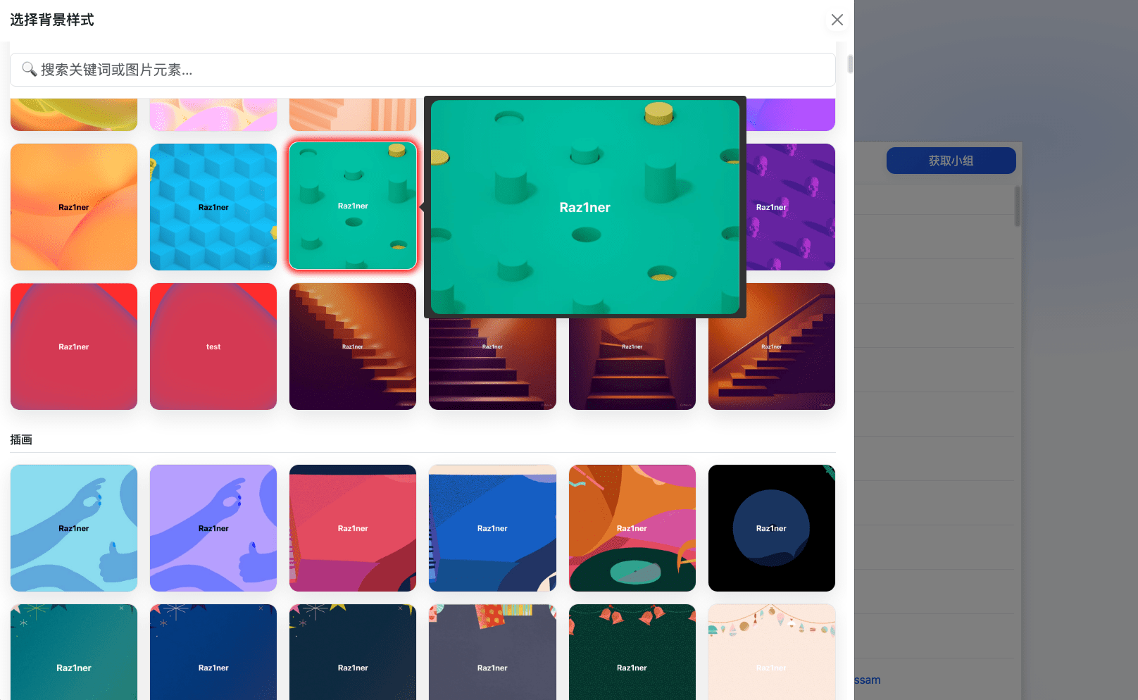 Click “Select Background.” Hover over a background to preview it in a larger view, or quickly find your favorite background by searching with keywords or image elements.