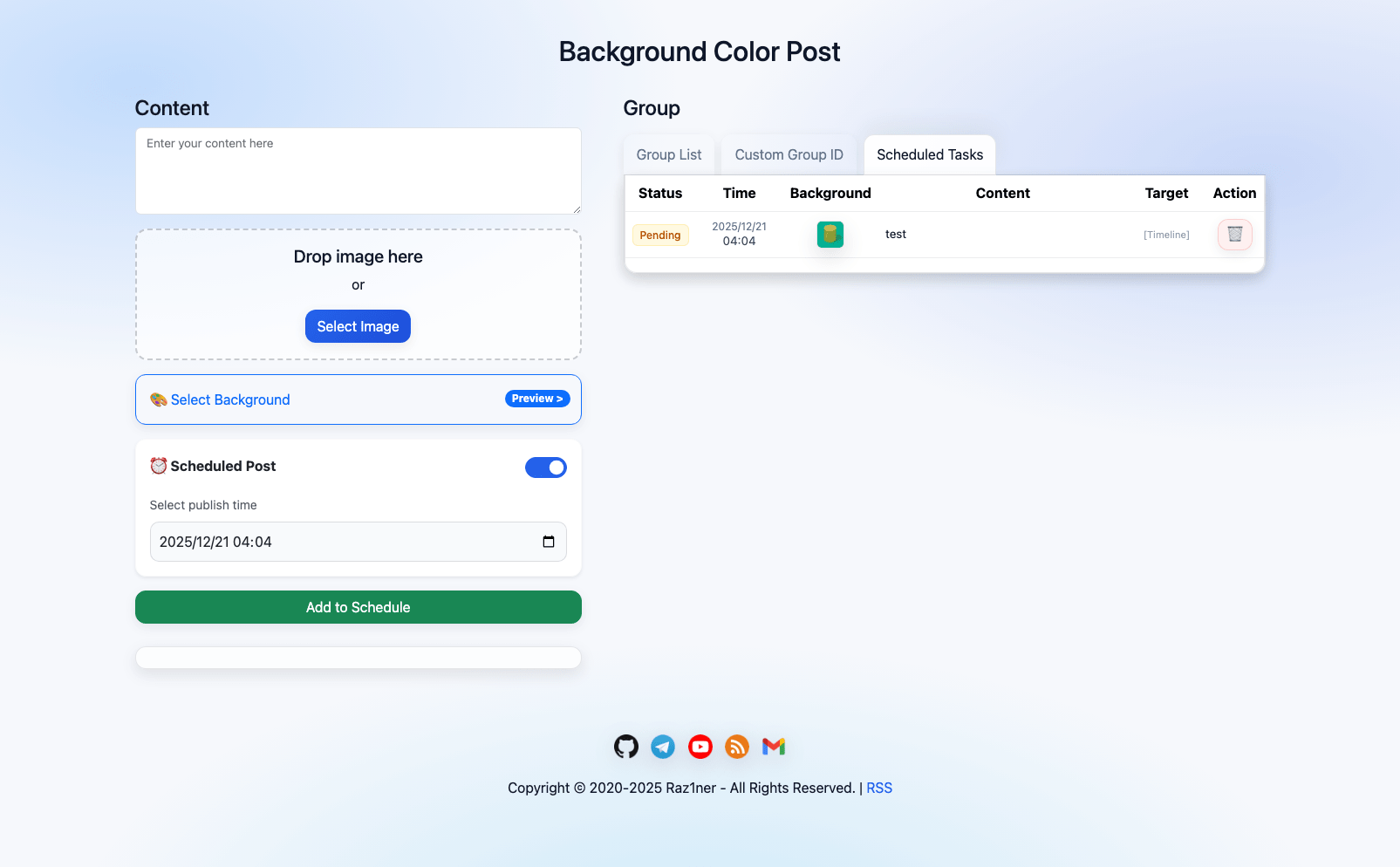 After setting up the content, enable “Scheduled Post” choose the desired posting time, and click “Add to Schedule”.