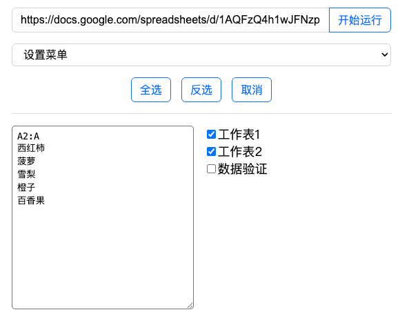 在右侧选择表格分页名称,在左侧输入框的第一行输入设置下拉菜单的范围,在下面输入需要设置下拉菜单的内容,一行一个,点击「开始运行」。