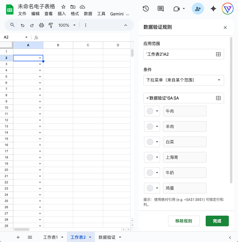 如果设置下拉菜单需要应用某个范围,可以在第二行直接写引用的范围,例如需要使用数据验证表格的 A 列,那么就设置“数据验证!A:A”