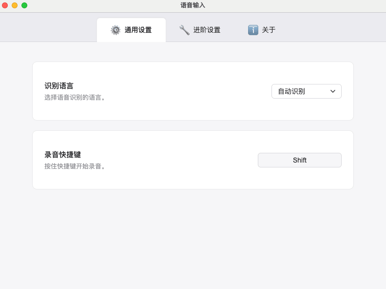 点击任意输入框 → 按住快捷键(默认 Shift)→ 开始说话 → 松开快捷键 → 软件会自动写入输入框。