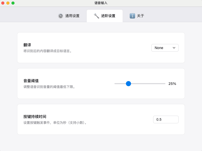 例如按住快捷键的时候,并没有说话,只是有环境的噪音,如果音量的阈值设置得太低,有可能会错误的识别文本,如果音量的阈值设置得高一些,就会忽略环境的噪音,只有在正常说话的时候,才会被识别到。