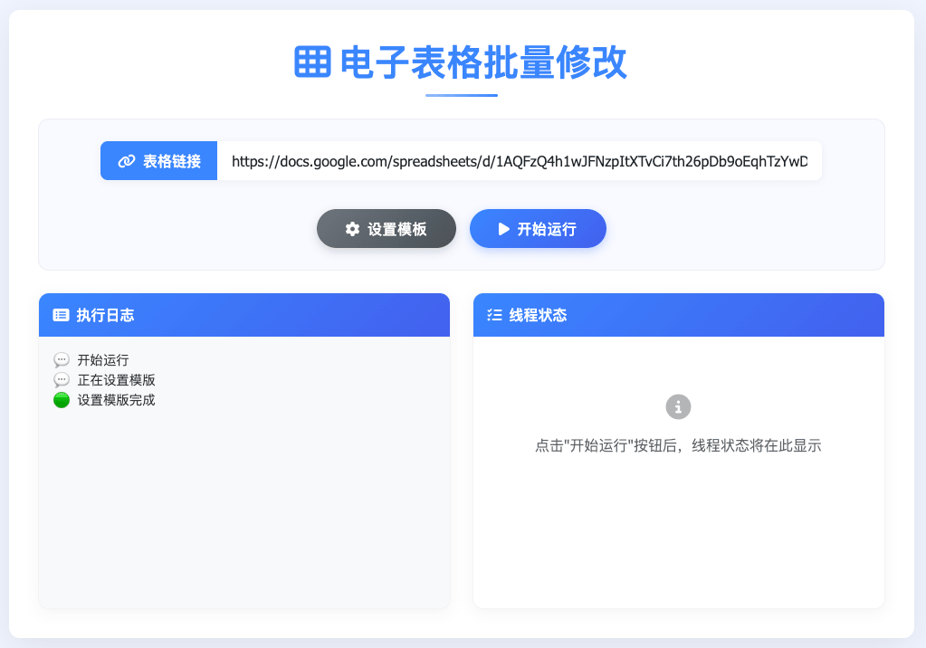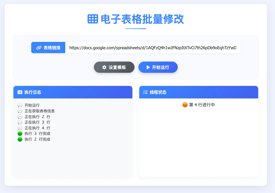 在电子表格批量修改工具点击「开始运行」后,会在线程状态显示正在处理的表格,执行日志会显示正在执行和执行的状态。