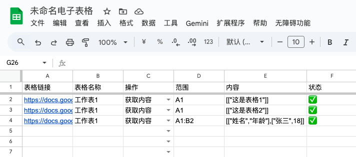 运行后,会把获取的内容写入到内容列中。写入的数据是 二维数组 的格式。如果获取的内容超过了 50000 字符,就会导致写入失败。